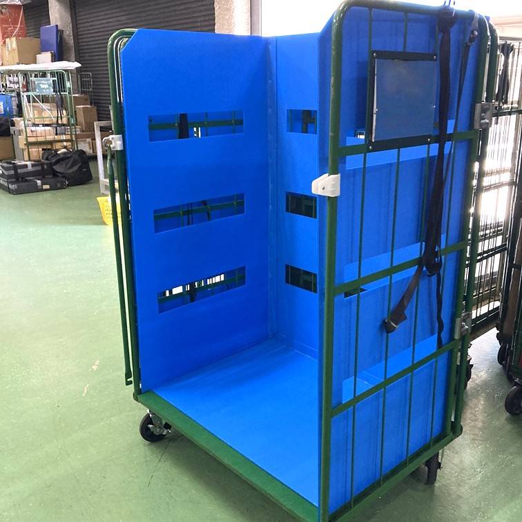 物流現場では、カゴ台車の目隠しカバーとして使用されます。積荷を隠すことでセキュリティを確保しつつ、ホコリの侵入を防ぐ効果もあります。軽量なため、マジックテープや結束バンドで簡単に固定可能です。